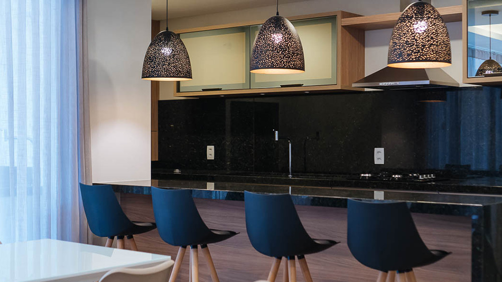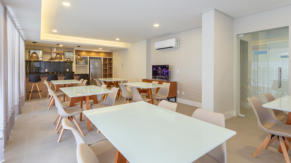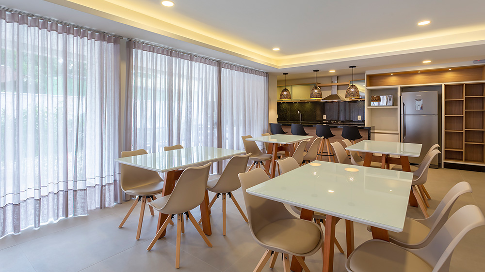 • Áreas comuns com piso porcelanato e rebaixamento em gesso;