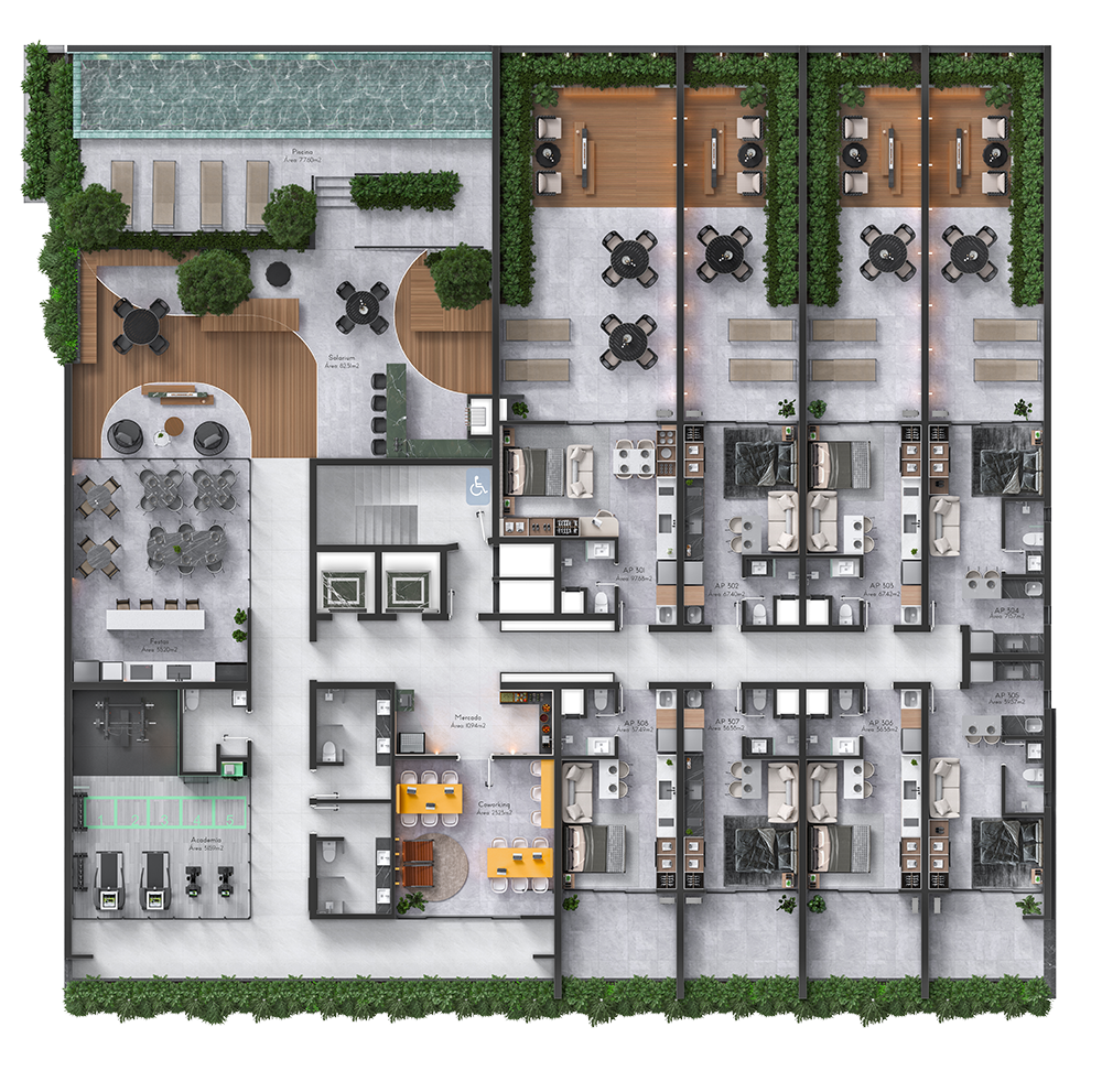 • Espaço Coworking e Mercado privativo para moradores.