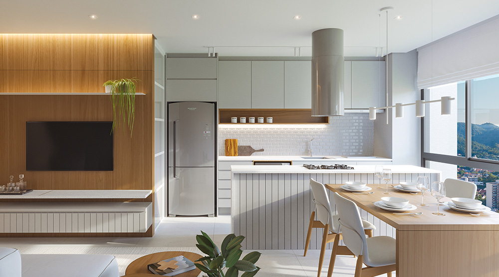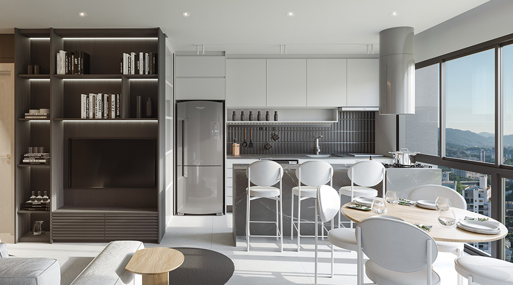 • Living completo, com salas de estar, jantar e cozinha integradas;