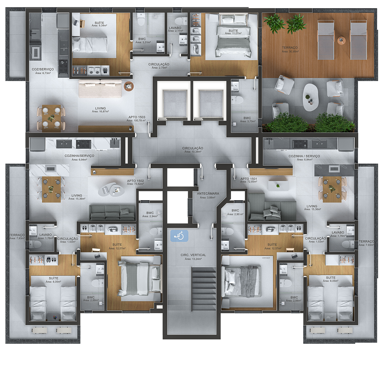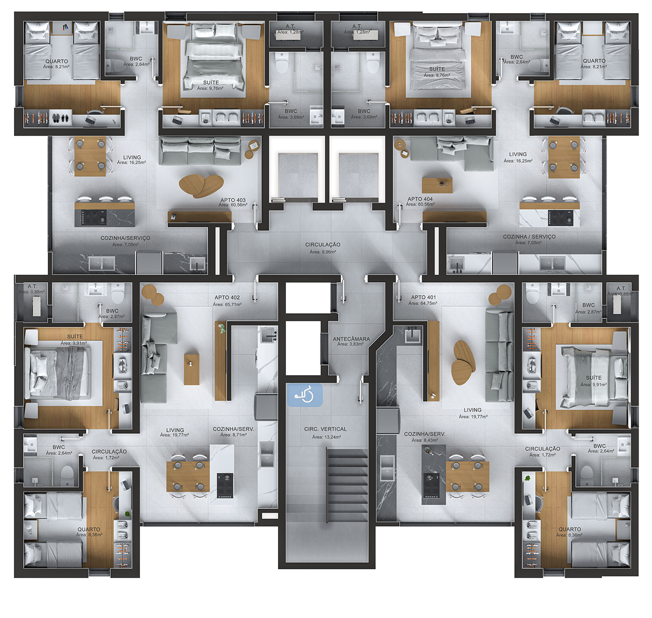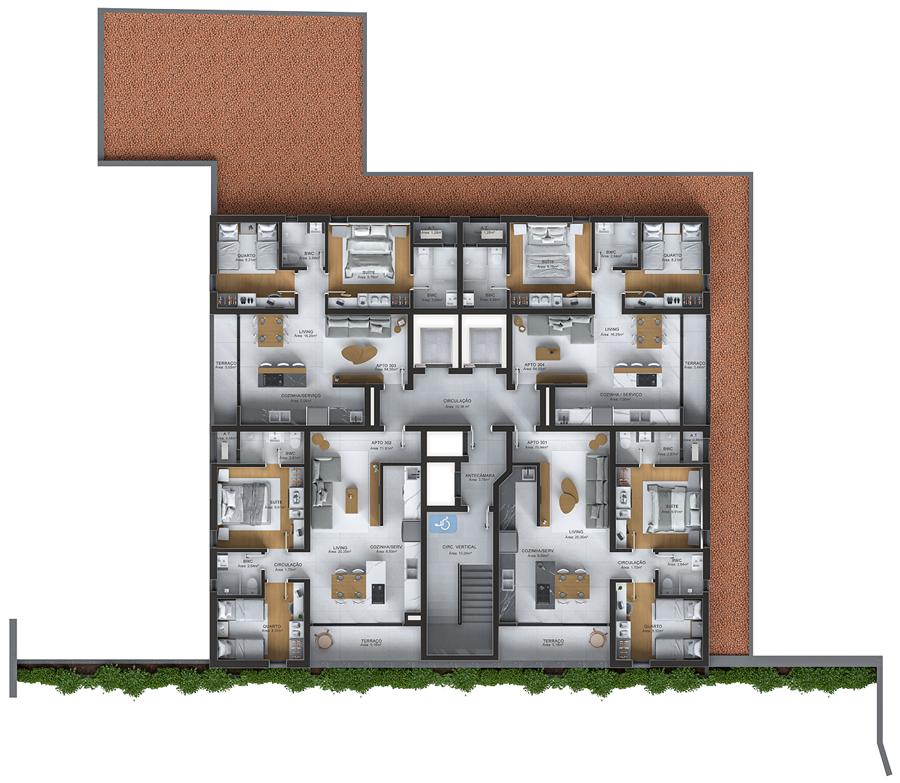 APARTAMENTOS TIPO LATERAL (TIPO 3 E 4) Área Privativa: 60,56m² Área Total: 102,78m²