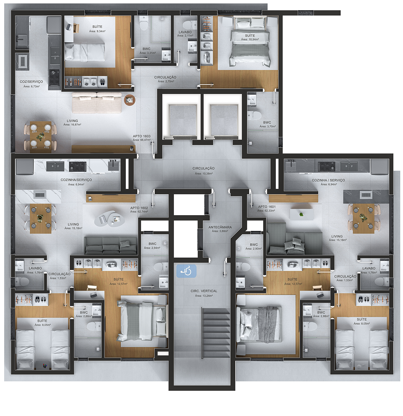 • Hall de Entrada entregue decorado e mobiliado, com rebaixamento em gesso diferenciado;