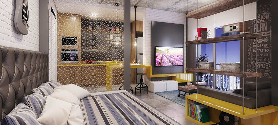 Studios com baixo valor de manutenção e alto valor agregado na arquitetura e localização.
