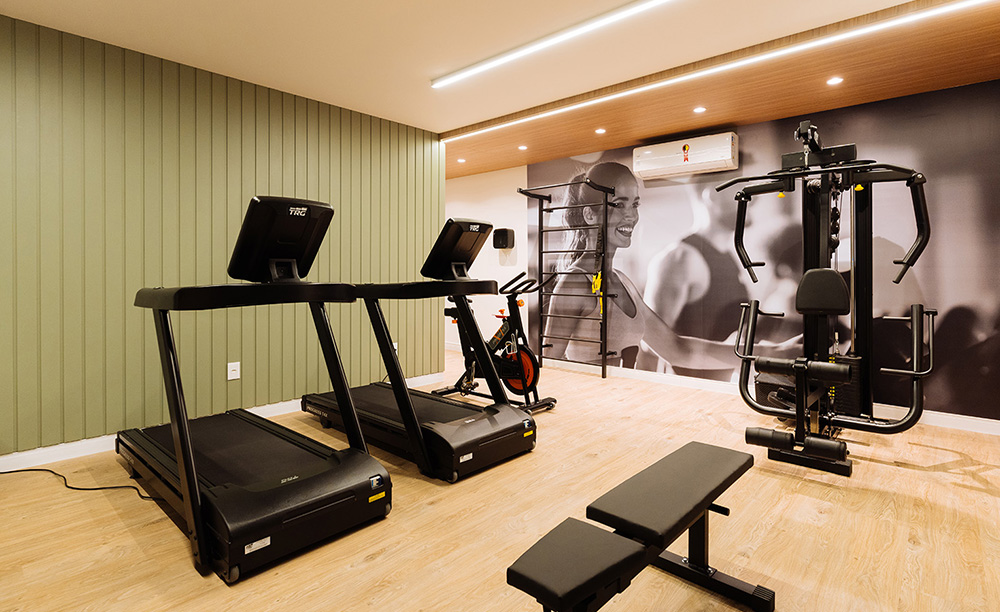 • Suítes com piso laminado de madeira